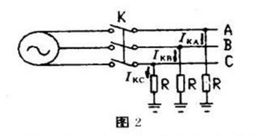 如圖2所示。在這種接法下,假如開關K誤投入,三相短路電流IKA、IKB、IKC將分別從各相接地線流入大地后成閉合回路。短路電流流經接地電阻R時,將在其上產生一個壓降: